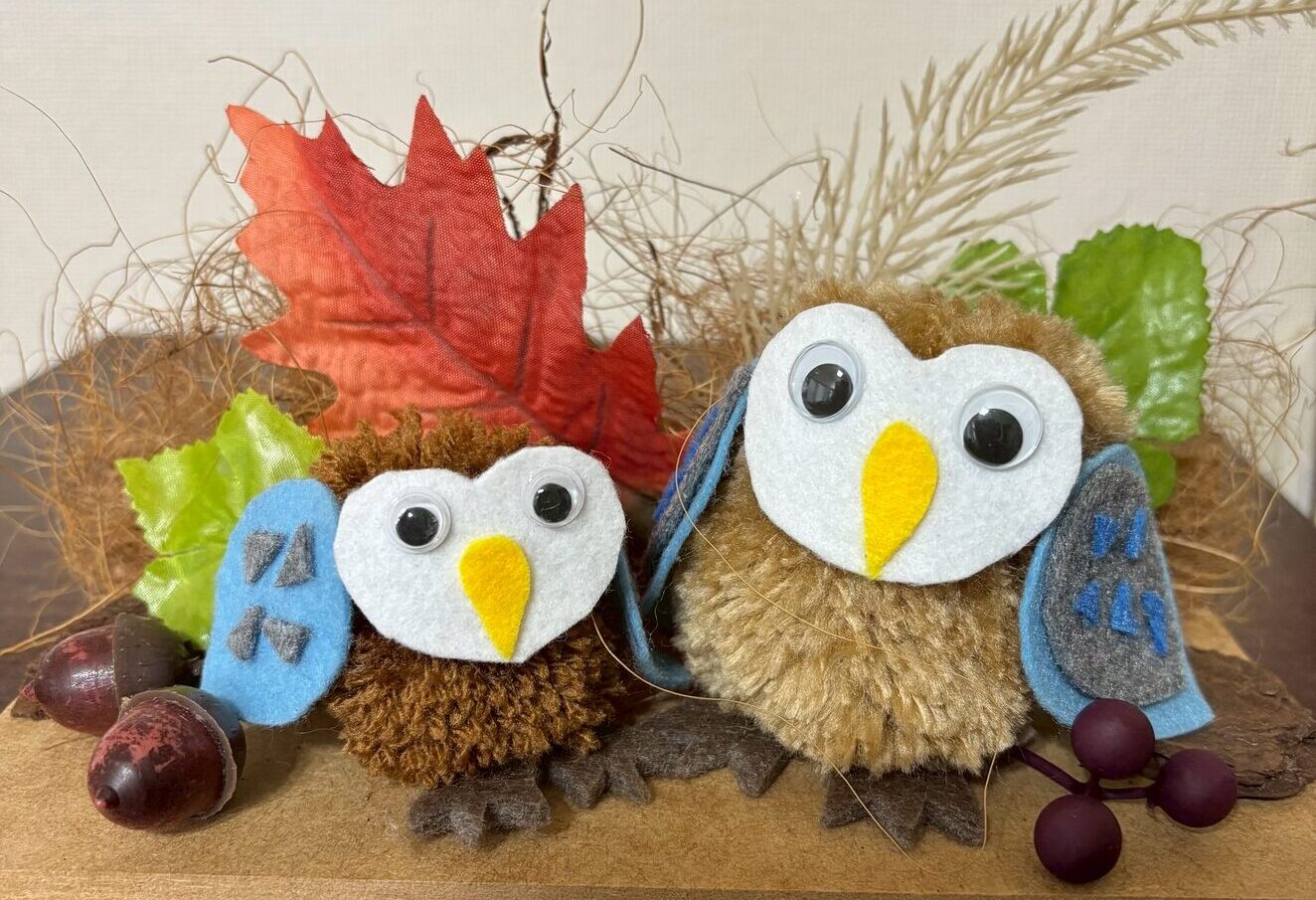 毛糸玉のカットの仕方で個性豊かなフクロウの親子ができました。