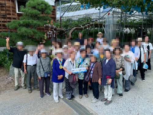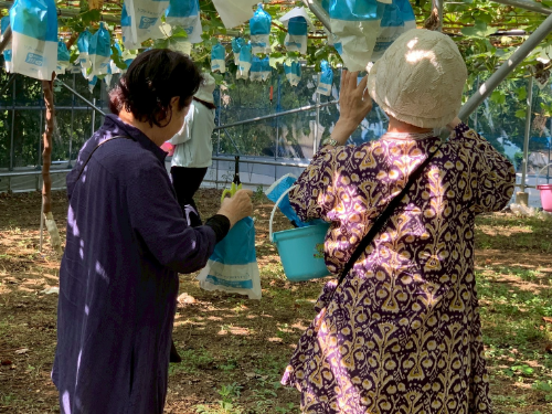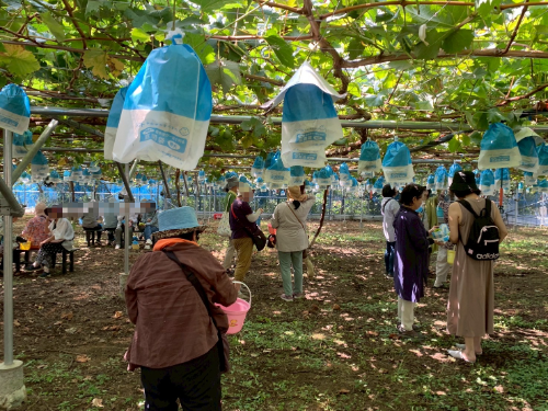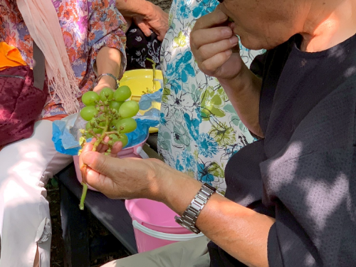 バスの中では親しい友達と並んでお喋りしていた参加者も、ぶどう棚の下では仲間の垣根を越えて言葉を交わし、笑顔で交流している姿が印象的でした。