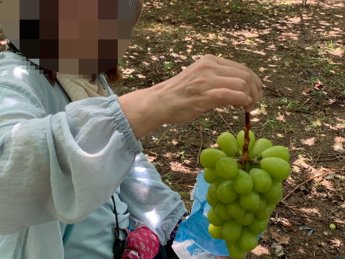 お互いが採ったブドウを口に運んで、「こっちの方が甘い」「○○さんは甘いブドウを見分けるのがうまいわね」などと収穫後のお喋りも盛り上がり、美味しく楽しいひと時を過ごしました。